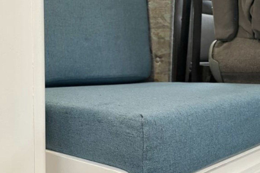 Dit was ooit een 3-persoonscamper met een vast bed achterin en mogelijkheid tot kinderbedje via een opklapbare tafel in het midden. Dat (kapotte) tafeltje is eruit gehaald, maar een bedje voorin is nog mogelijk met een losse plank. De originele kussens die zich tot matras vormen zijn er nog.