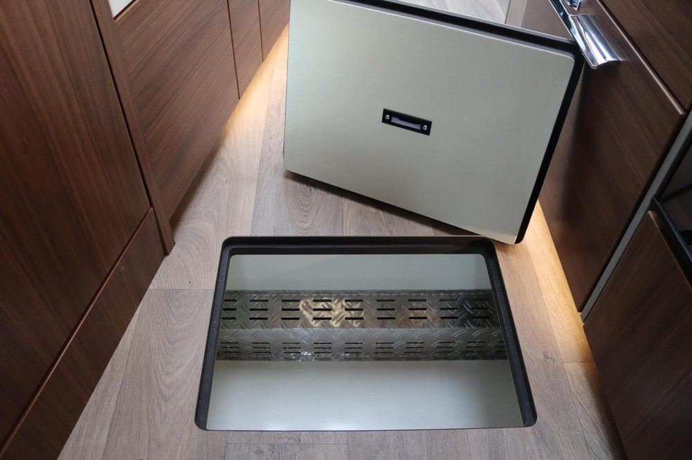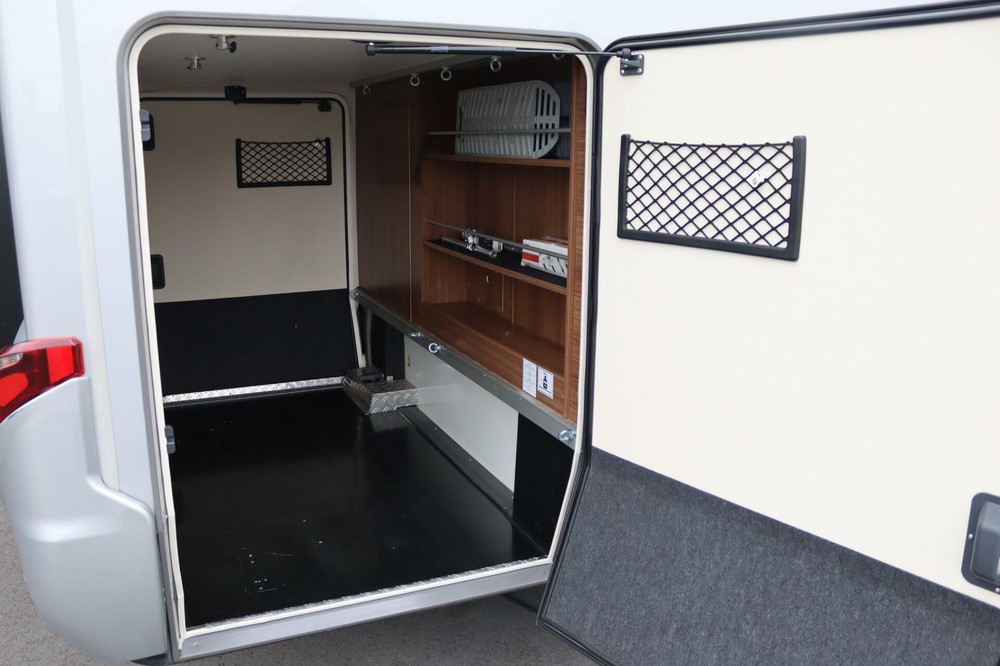 Luxe en praktische detailsDe Hymer BMC-T 580 biedt een ruime zithoek met een L-zit die ontstaat door de draaibare voorstoelen. Het elegante Noce Cognace meubeldecor in combinatie met de luxe Kitami bekleding zorgt voor een verfijnde uitstraling. Dankzij de dubbele bodem, die verwarmd is en extra opbergruimte biedt, kun je jouw spullen veilig en droog opbergen. De 180 liter schoonwatertank en de 150 liter vuilwatertank zijn weggewerkt in de dubbele bodem, terwijl je vanuit de buitenkant eenvoudig toegang hebt tot de opslagruimte. De ruime garage heeft een laadhoogte van 132 cm, is aan beide zijden toegankelijk en biedt voldoende ruimte voor uw fietsen, scooter en bagage.