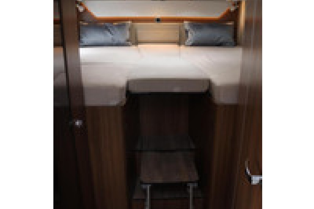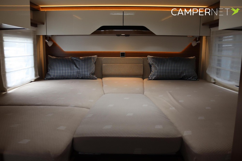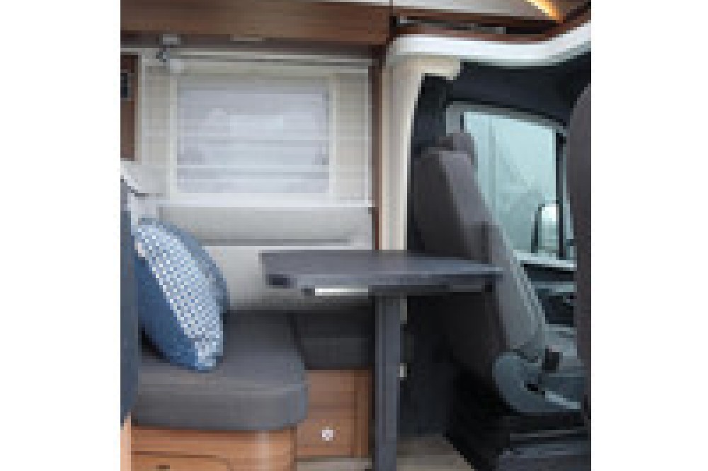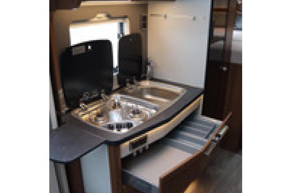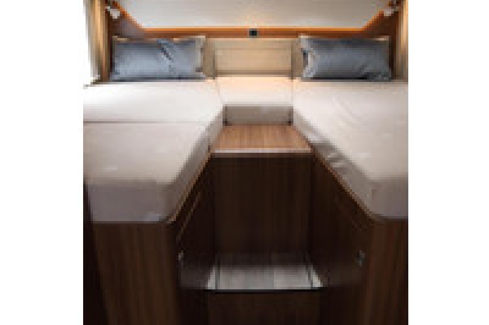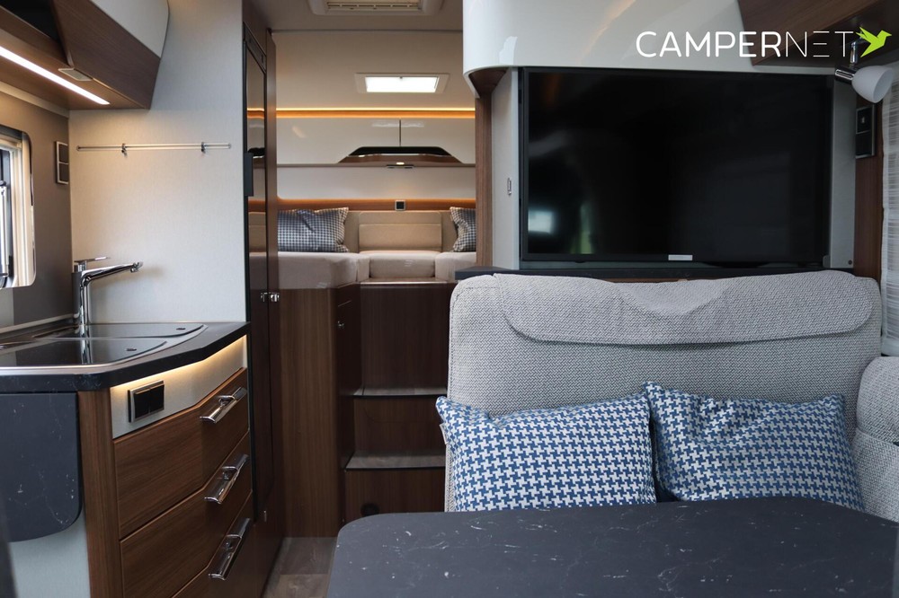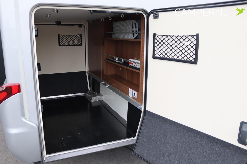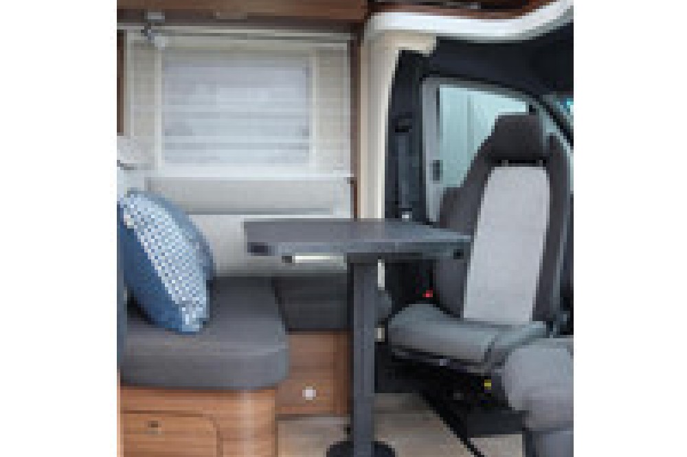 De Hymer BMC-T 580 biedt een ruime zithoek met een L-zit die ontstaat door de draaibare voorstoelen. Het elegante Noce Cognace meubeldecor in combinatie met de luxe Kitami bekleding zorgt voor een verfijnde uitstraling. Dankzij de dubbele bodem, die verwarmd is en extra opbergruimte biedt, kun je jouw spullen veilig en droog opbergen. De 180 liter schoonwatertank en de 150 liter vuilwatertank zijn weggewerkt in de dubbele bodem, terwijl je vanuit de buitenkant eenvoudig toegang hebt tot de opslagruimte. De ruime garage heeft een laadhoogte van 132 cm, is aan beide zijden toegankelijk en biedt voldoende ruimte voor uw fietsen, scooter en bagage.