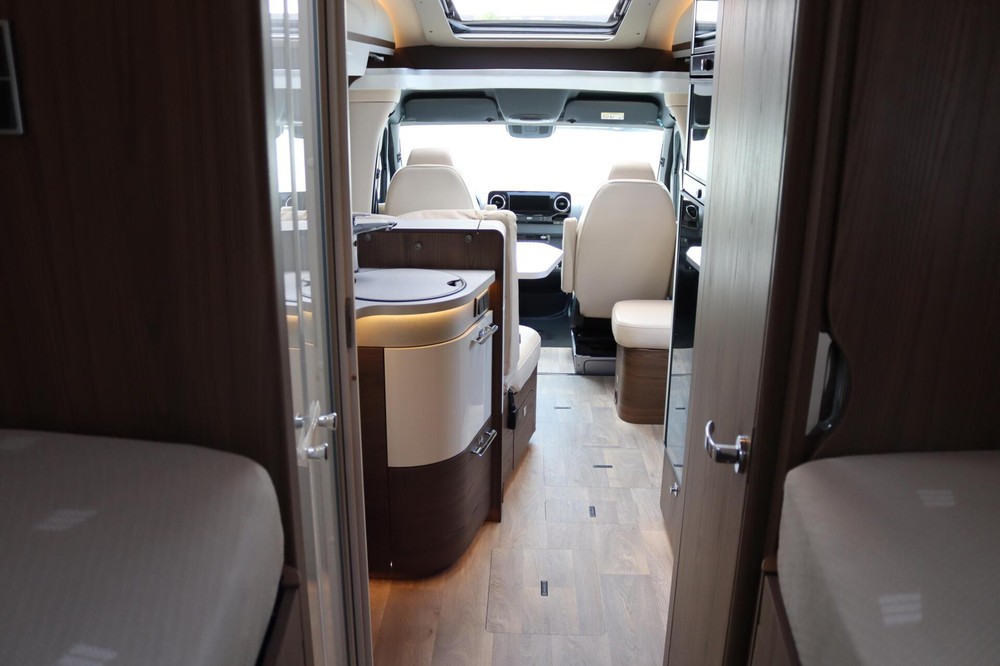 Panorama cabine met toptechnologieIn de cabine van de Hymer B-ML T 780 geniet je van een panoramisch uitzicht, zodat je niet alleen de omgeving optimaal kunt bewonderen, maar ook tijdens het rijden goed overzicht hebt op het verkeer. Het Mercedes-Benz MBUX multimedia systeem zorgt voor een soepele navigatie- en entertainmentervaring, terwijl de luxe pilotenstoelen, die volledig verstelbaar en draaibaar zijn, het comfort verhogen.