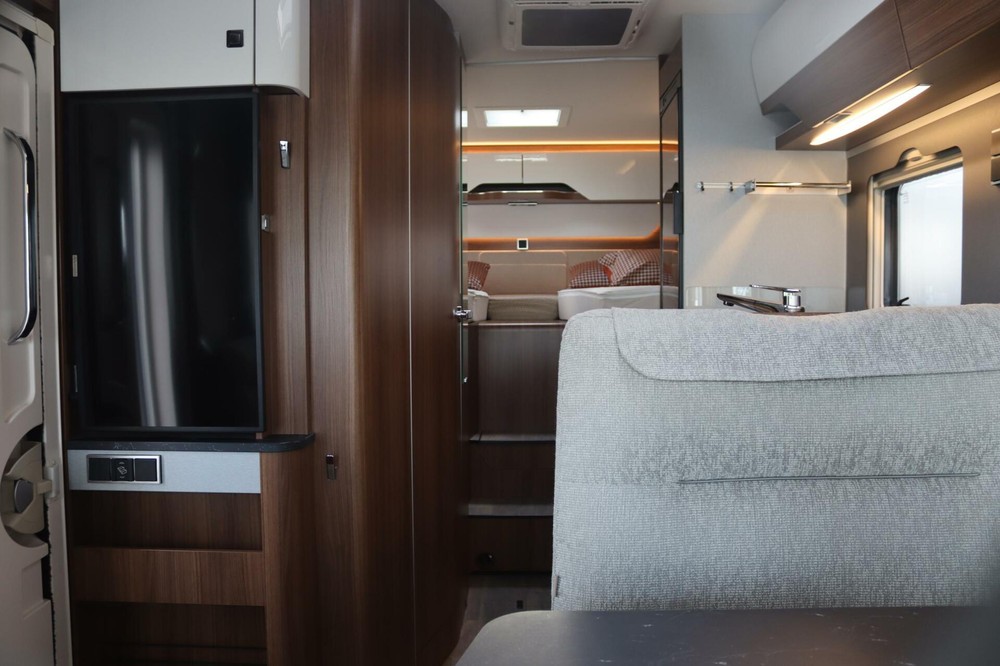 Luxe en praktische detailsDe Hymer BMC-I 600 biedt een ruime zithoek met een L-zit die ontstaat door de draaibare voorstoelen. Het elegante Noce Cognac meubeldecor in combinatie met de luxe Porto bekleding zorgt voor een verfijnde uitstraling. Dankzij de dubbele bodem, die verwarmd is en extra opbergruimte biedt, kun je jouw spullen veilig en droog opbergen. De 180 liter schoonwatertank en de 150 liter vuilwatertank zijn weggewerkt in de dubbele bodem, terwijl je vanuit de buitenkant eenvoudig toegang hebt tot de opslagruimte. De ruime garage heeft een laadhoogte van 132 cm, is aan beide zijden toegankelijk en biedt voldoende ruimte voor uw fietsen, scooter en bagage.
