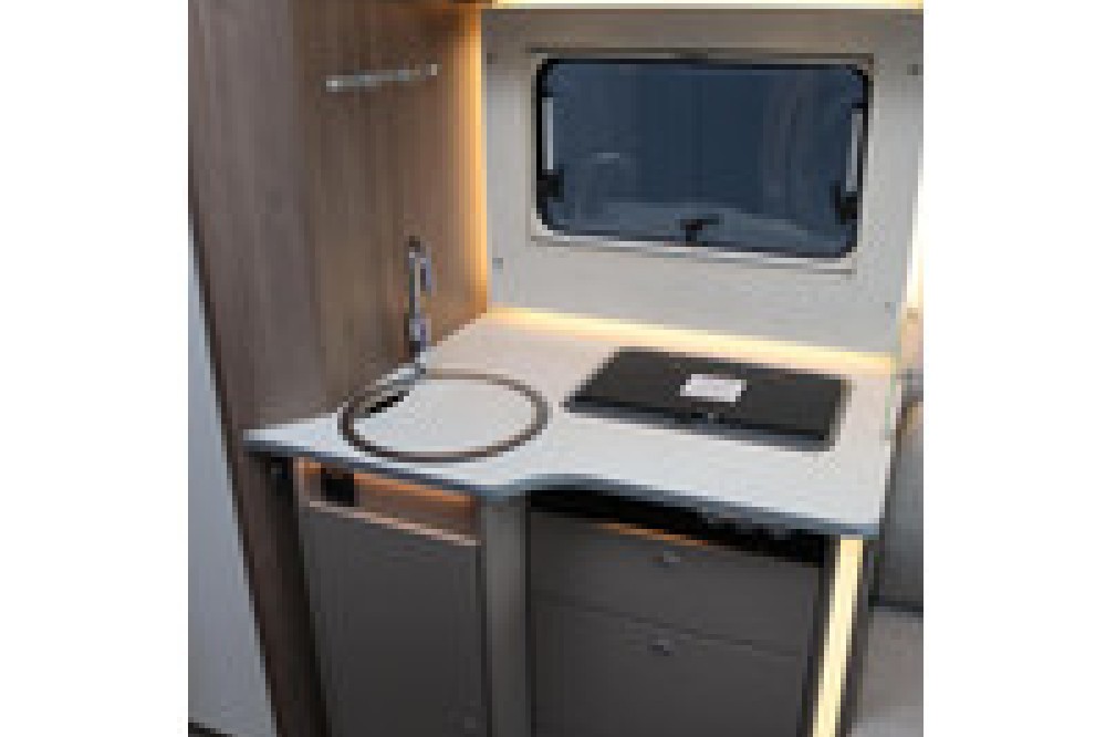 hoekkeuken maakt het mogelijk om heerlijke maaltijden te bereiden tijdens je avonturen onderweg zonder af te zien van het comfort van een goed uitgeruste keuken. De koelkast heeft standaard een inhoud van 98 liter en biedt genoeg ruimte om etenswaren vers en drankjes aangenaam koel te houden.
