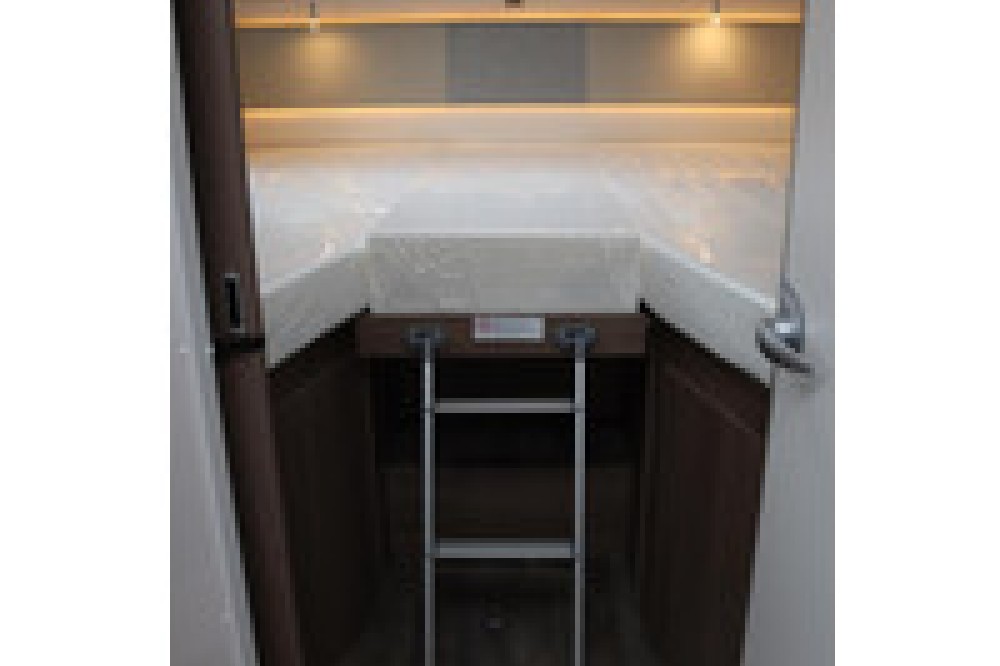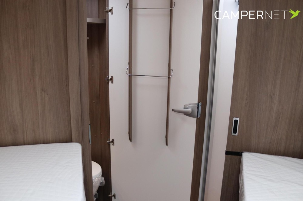 eenpersoonsbedden in het achterste gedeelte bieden niet alleen comfortabele slaapplaatsen, maar zorgen ook voor slim ruimtegebruik. Door de combinatie van badkamer en slaapgedeelte met kasten onder het bed is alles binnen handbereik en georganiseerd in een aparte ruimte.