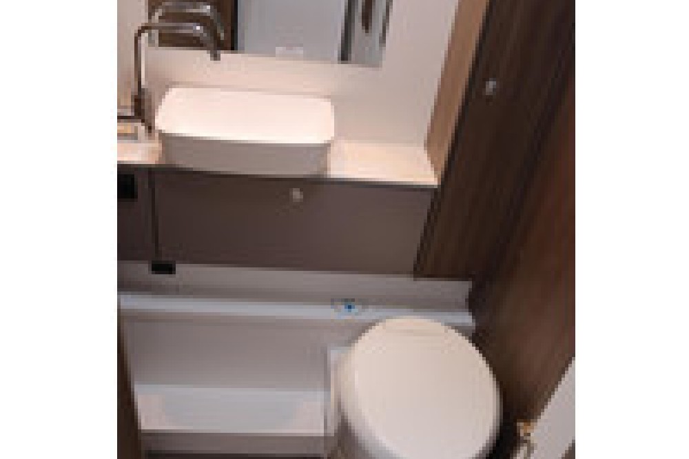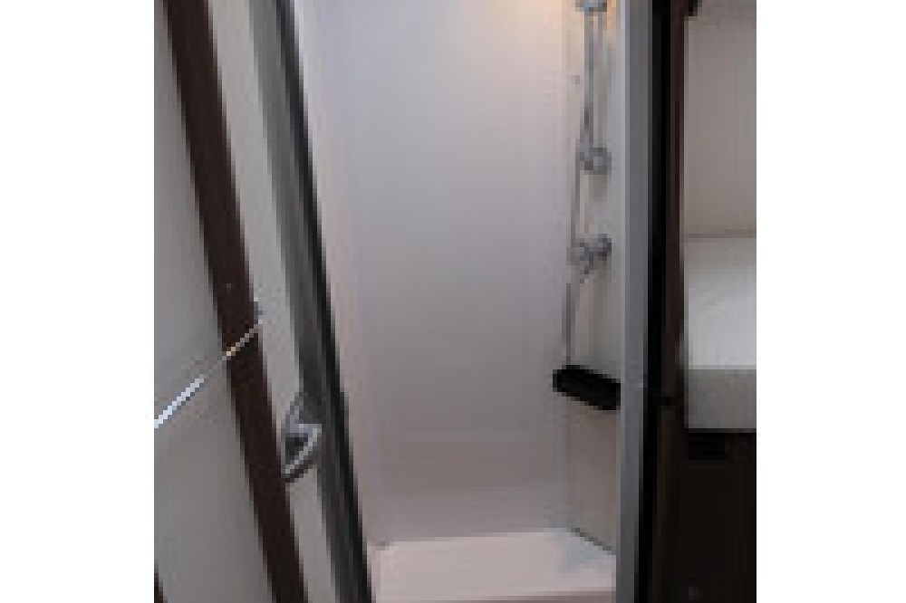 badkamer heeft een aparte douche en maakt gebruik van schuifdeuren om een aparte badkamer te creëren in het middengedeelte van het voertuig, onafhankelijk van het woon- en slaapgedeelte. Dit ontwerp zorgt voor privacy en verhoogt het comfort tijdens het reizen aanzienlijk.
