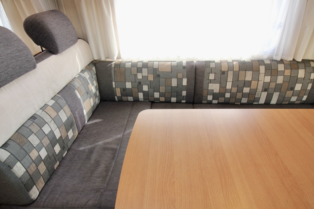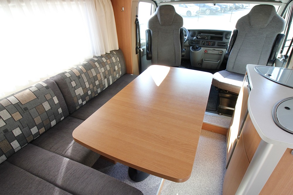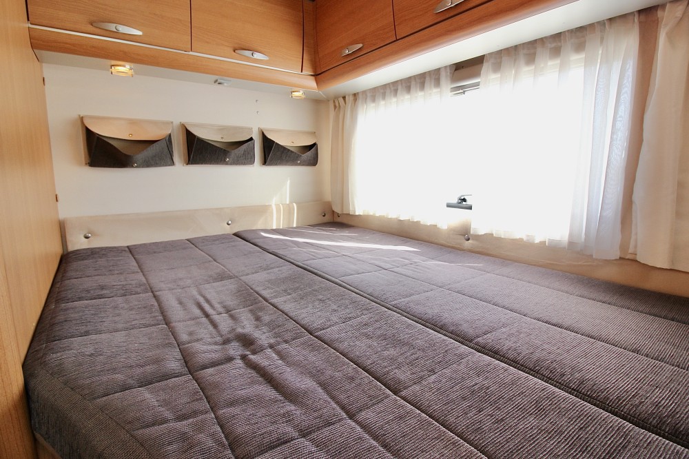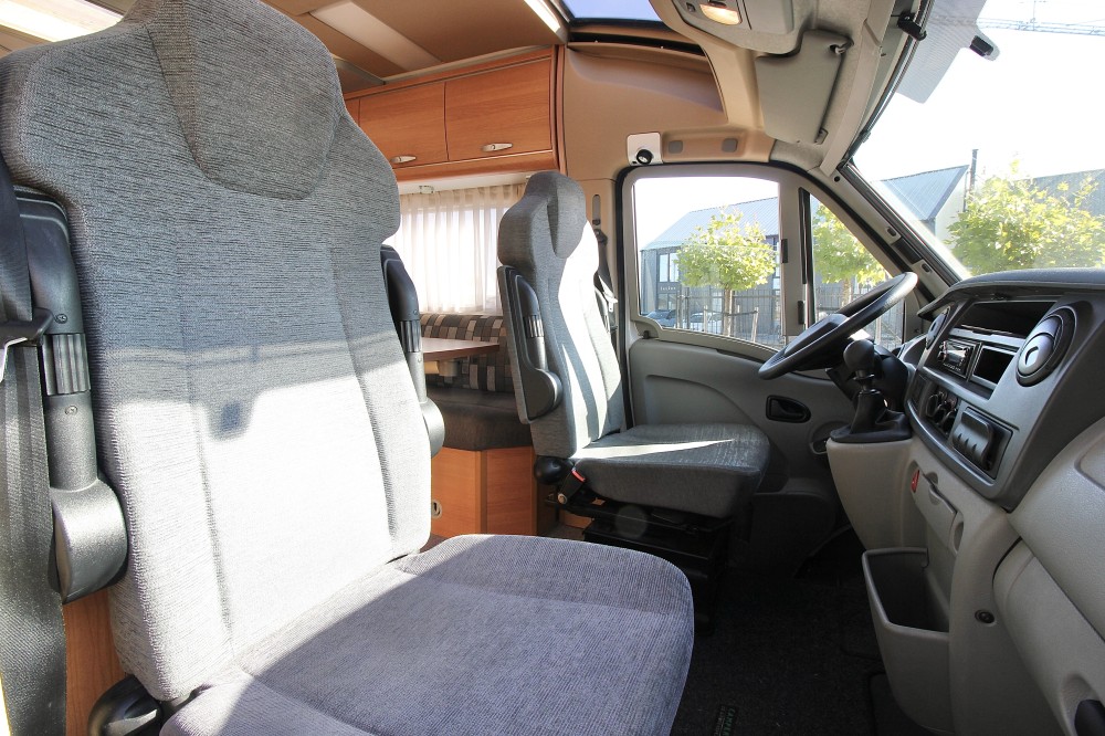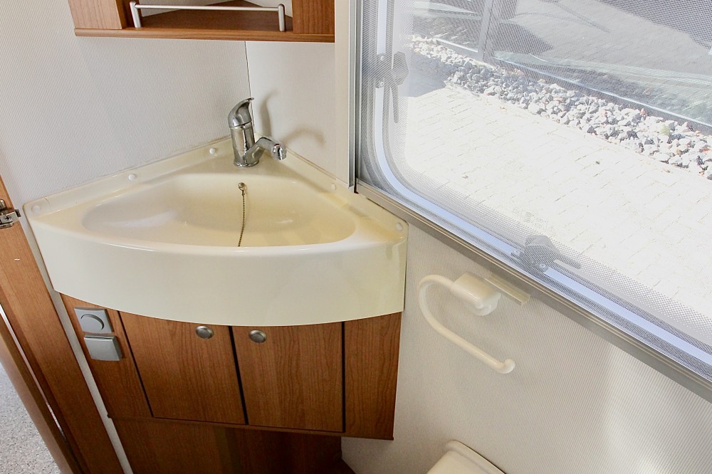 Achterin een “Frans bed”(190×130),daarnaast de badkamer met een wastafel, draaibaar toilet en een afsluitbare douche, een ruime hang/leg kast, de keuken is voorzien van een 3-pits gaskomfoor, rvs spoelunit en een koelkast met vriesvak. Een zeer ruime L-zit, om te bouwen tot 2-pers.slaapplaats. 2 comfortabele draaistoelen.