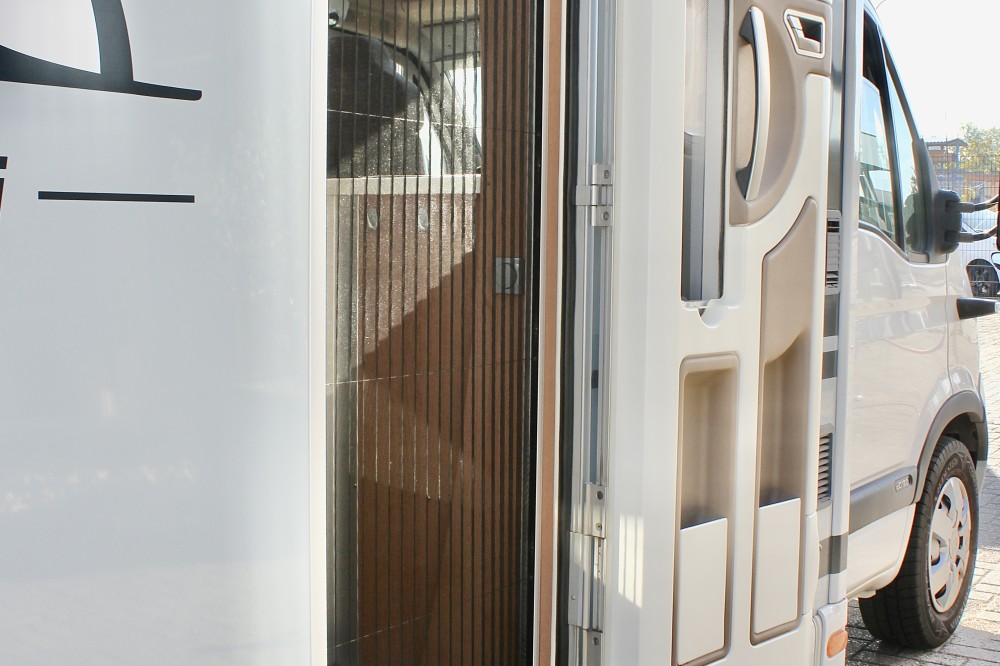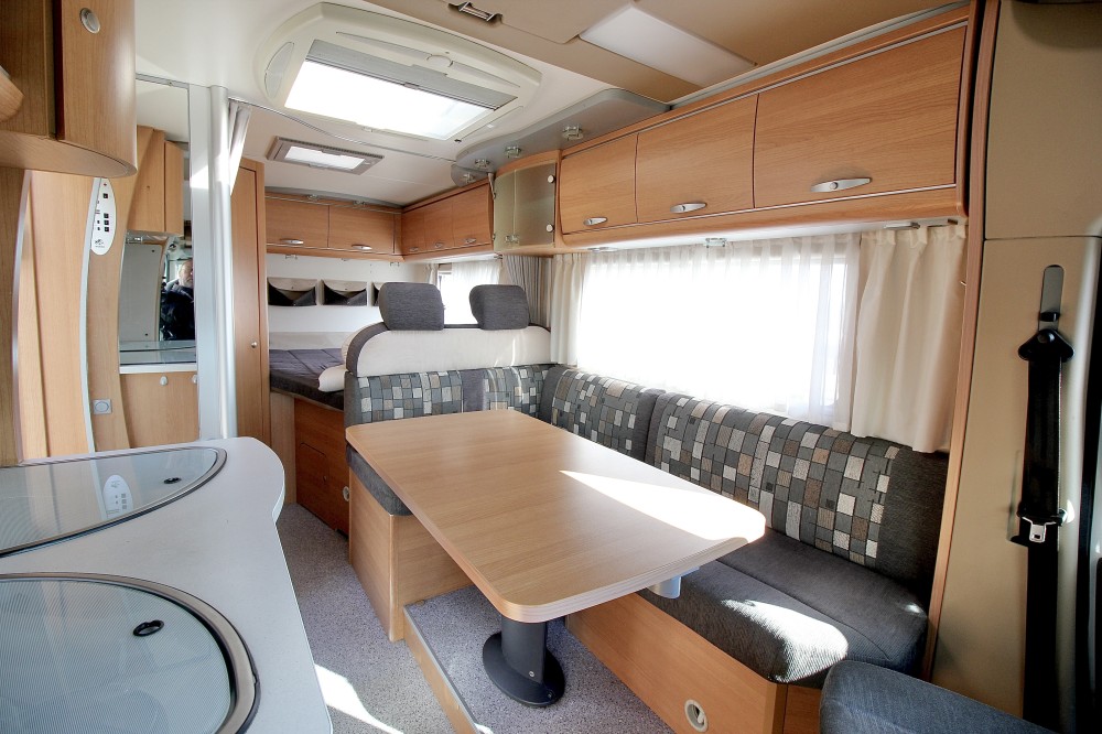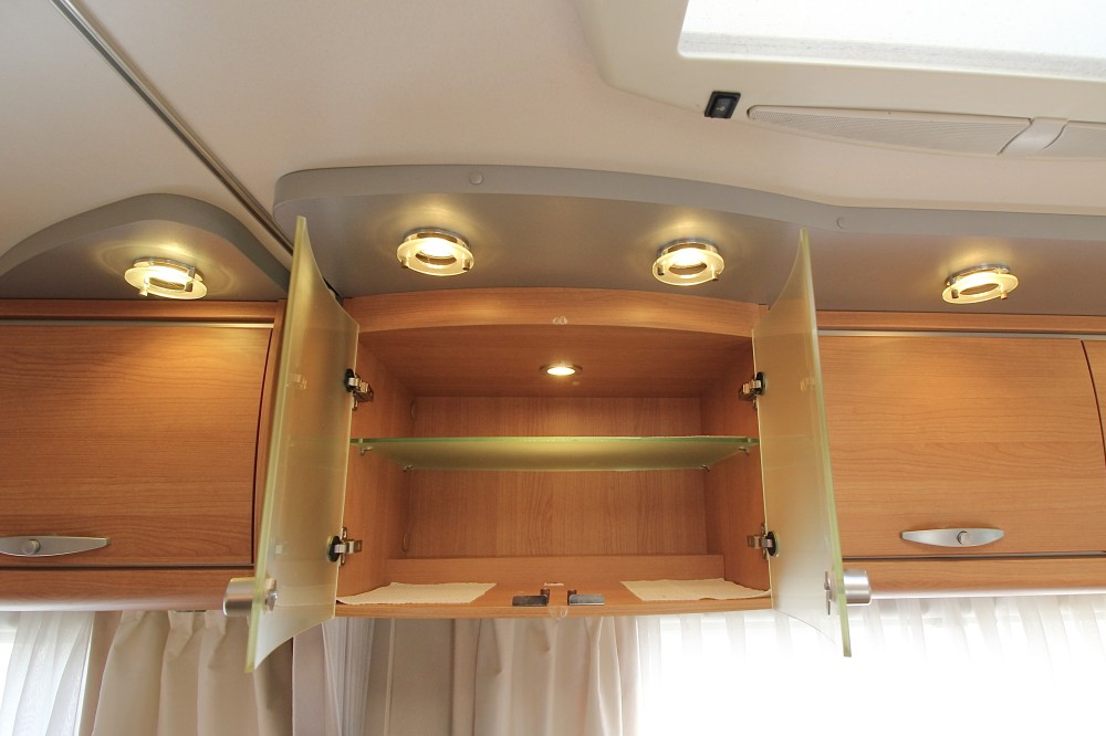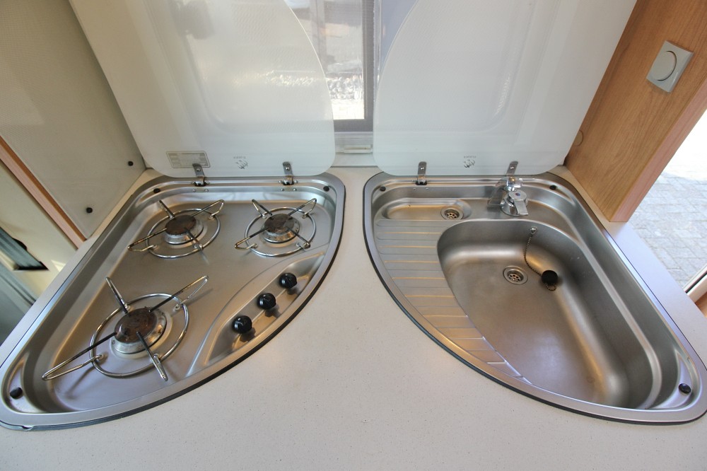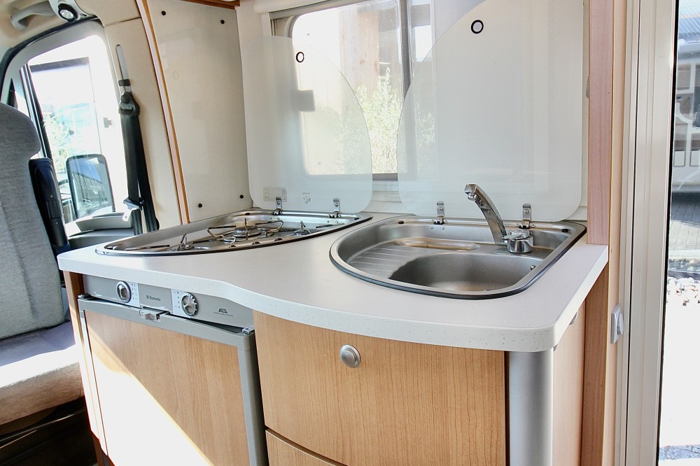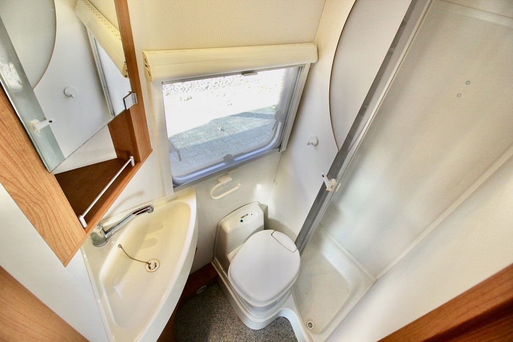 Achterin een “Frans bed”(190×130),daarnaast de badkamer met een wastafel, draaibaar toilet en een afsluitbare douche, een ruime hang/leg kast, de keuken is voorzien van een 3-pits gaskomfoor, rvs spoelunit en een koelkast met vriesvak. Een zeer ruime L-zit, om te bouwen tot 2-pers.slaapplaats. 2 comfortabele draaistoelen.