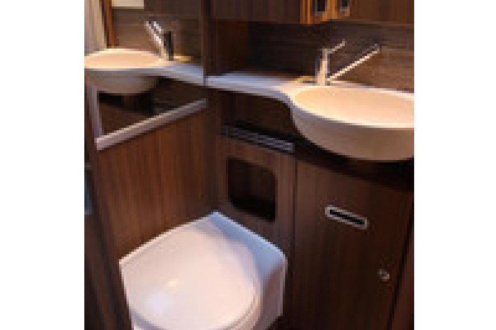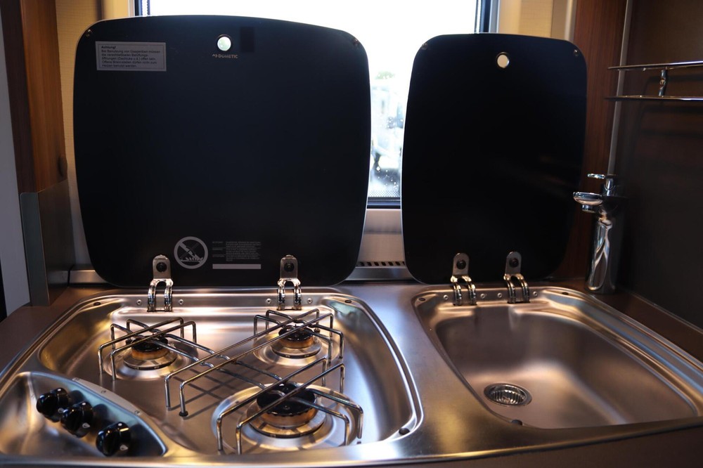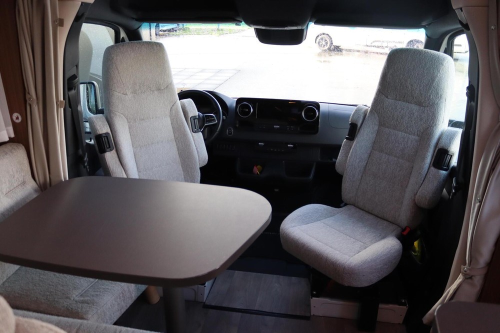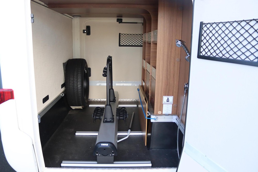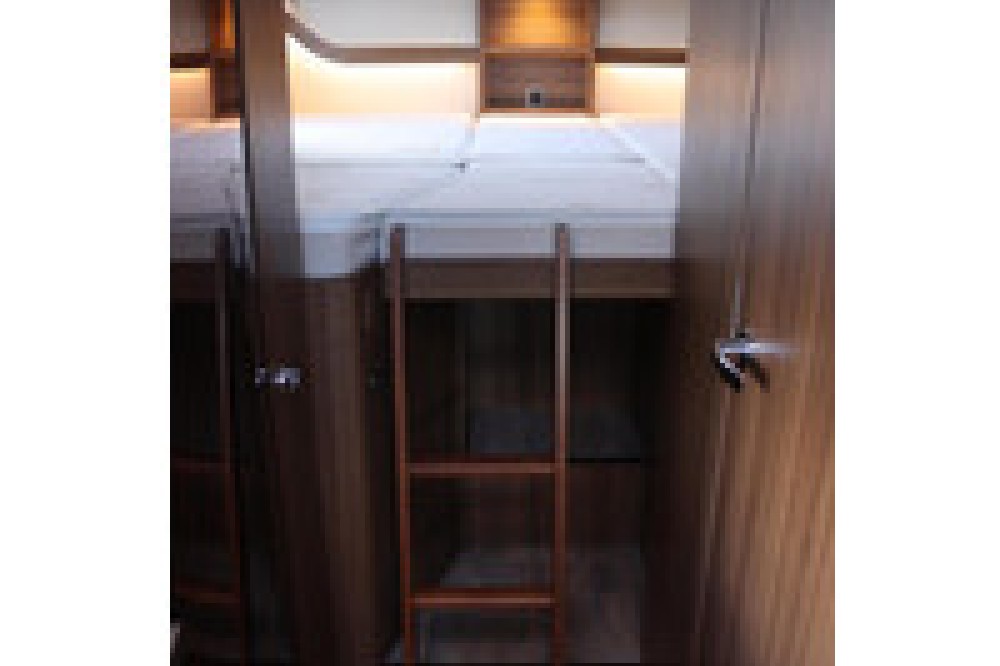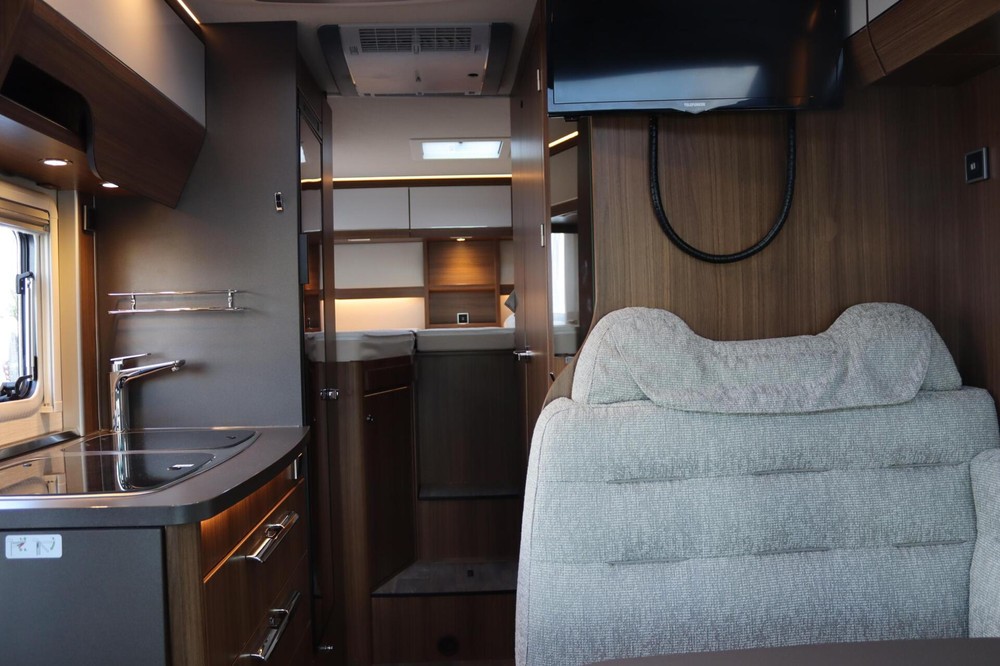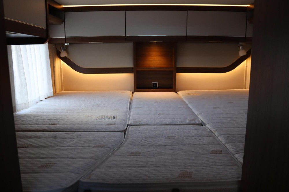 Het interieur van de camper straalt warmte en luxe uit met de donkere houten afwerkingen. Geniet van een goede nachtrust in de comfortabele lengte bedden. De grote garage biedt volop ruimte voor al uw bagage en kampeerspullen, ideaal voor lange reizen.