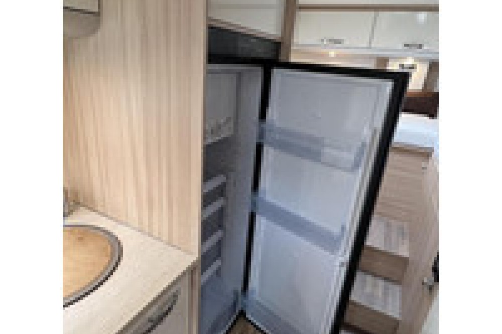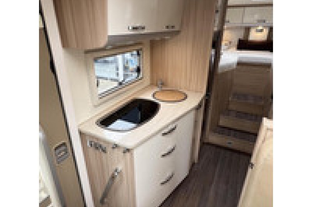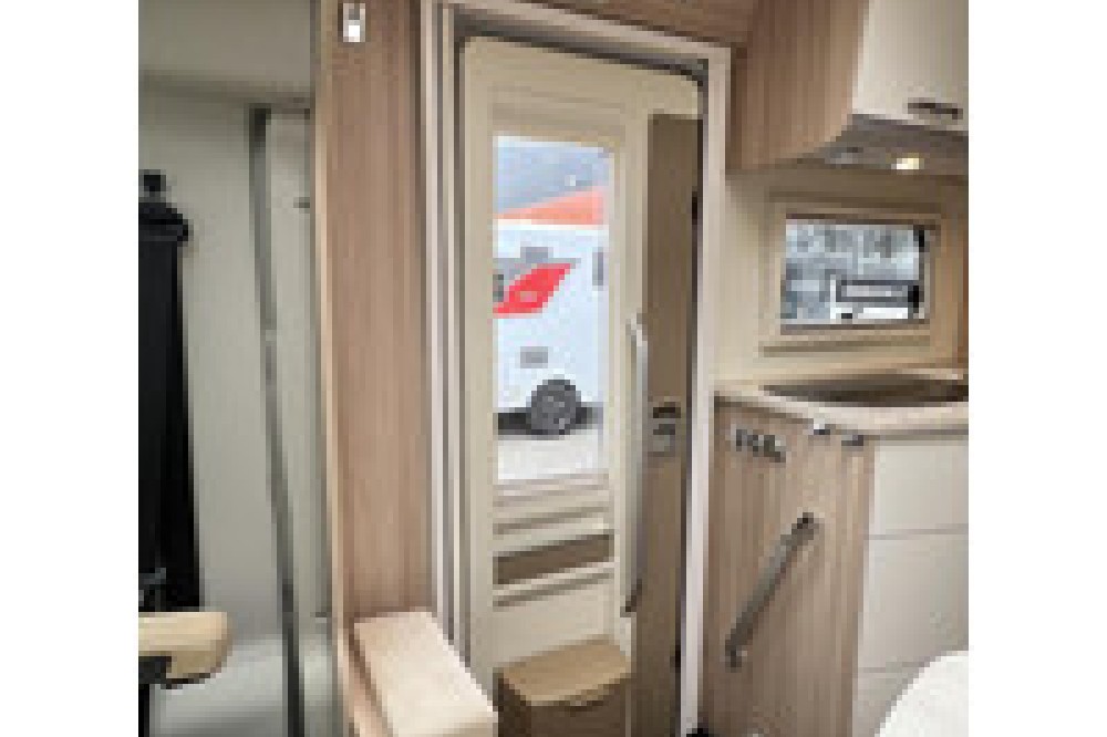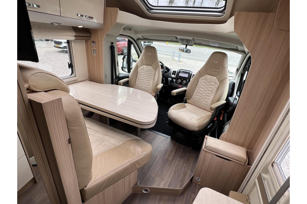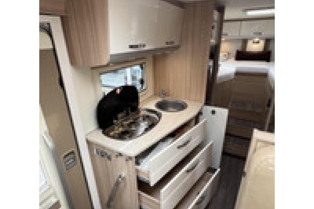 De gewilde indeling van deze camper biedt een ruime rondzit met comfortabele draaistoelen, waar u kunt ontspannen en genieten van gezellige momenten met familie en vrienden. De ruime rechte keuken is uitgerust met lades, een 3-pits gasstel en een grote koelkast met vriezer, waardoor u al uw culinaire avonturen kunt realiseren.