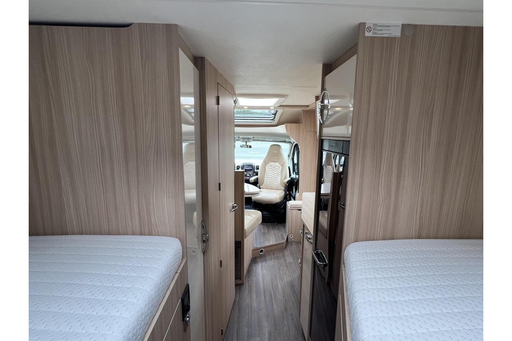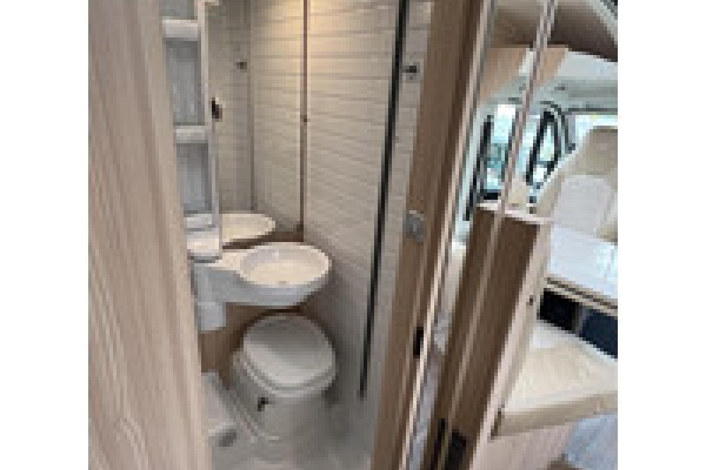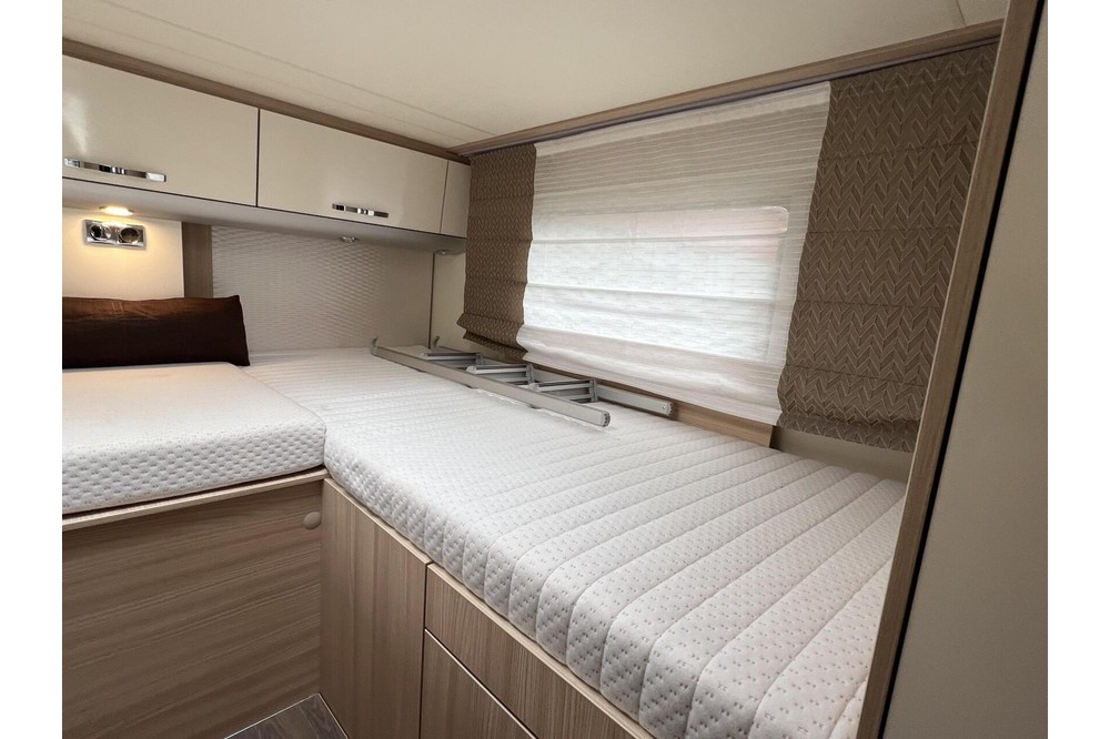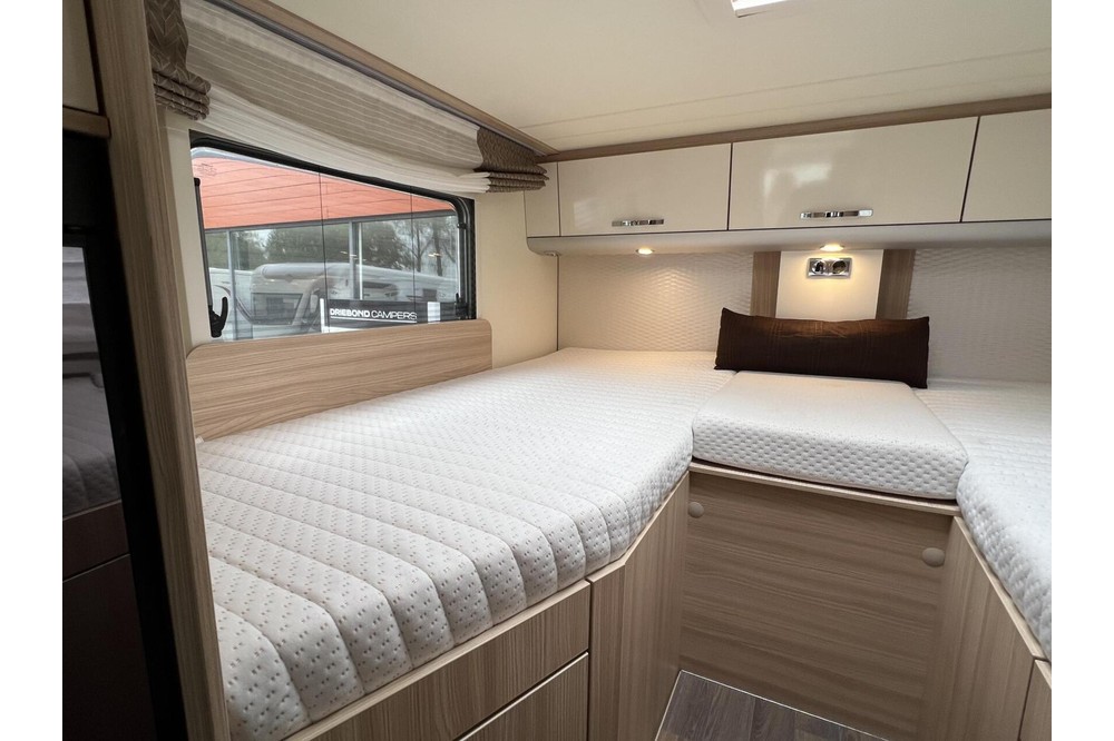 De aparte douche/toilet ruimte biedt privacy en comfort, zodat u zich helemaal kunt opfrissen na een lange dag vol avontuur. Achterin de camper vindt u twee enkele bedden die eenvoudig kunnen worden omgebouwd tot een groot bed. Onder de bedden bevindt zich een ruime XXL garage waar u al uw benodigdheden kunt opbergen voor een zorgeloze reis.