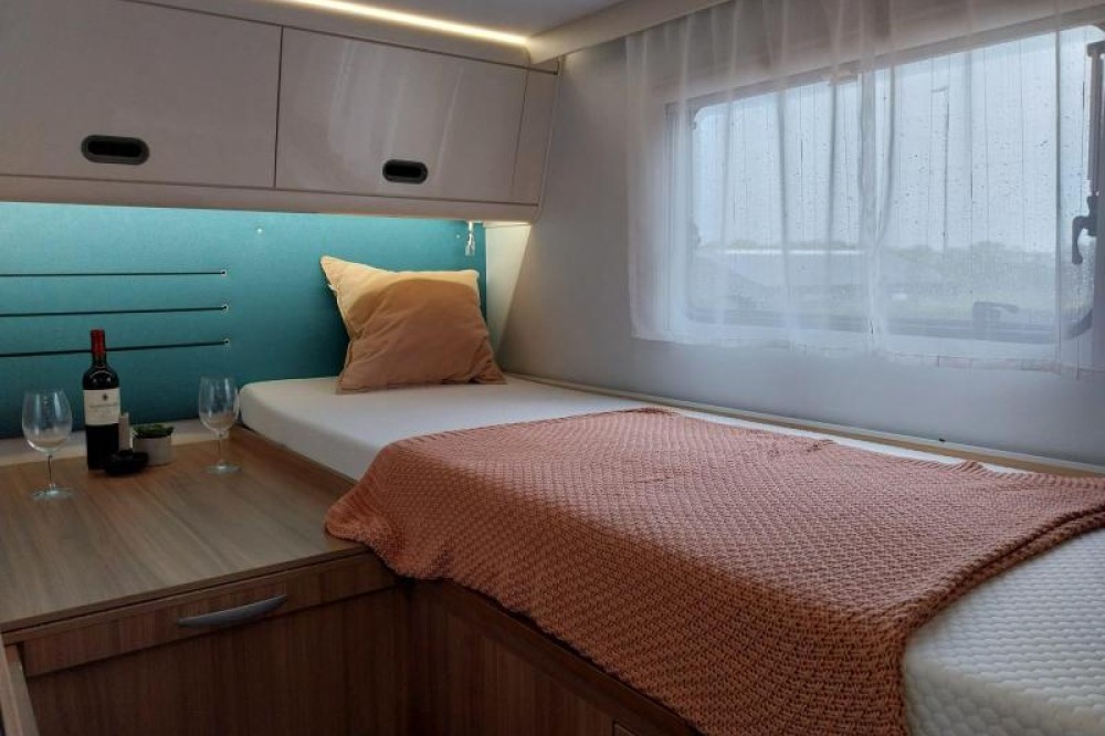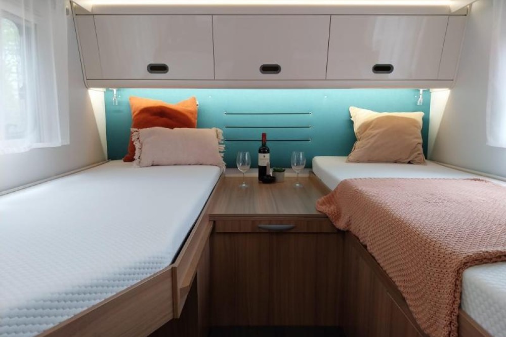 U bespaart enorm veel ruimte dankzij het hefbed, waarin 2 personen een slaapplaats vinden. Dit hefbed heeft een lengte van 185 cm em os 123 cm breed. De twee aparte bedden waarover de camper beschikt, bieden een gemakkelijke instap. Deze bedden heben een lengte van 209 / 206 cm en zijn beide 77 cm breed. Deze bedden kunnen zelfs als één groot bed gebruikt worden. Dan heeft dit een lengte van 209 cm en is 200 cm breed. In de badkamer kunt u zich heerlijk opfrissen bij de wastafel. Verder is er ook een cassettetoilet ingebouwd. Naast het slaapgedeelte bevindt zich ook de douchegelegenheid.
