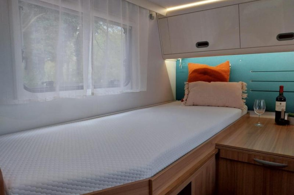 Door de hordeur, waarmee deze camper is uitgerust, houdt u vliegen en andere insecten buiten de deur. Het ontbreekt zelfs de veeleisende kampeerder aan niets; de vaste afvalwatertank, de leeslampjes en de buitenlamp zijn een kleine greep uit de vele details die deze camper zeer de moeite waard maken.
