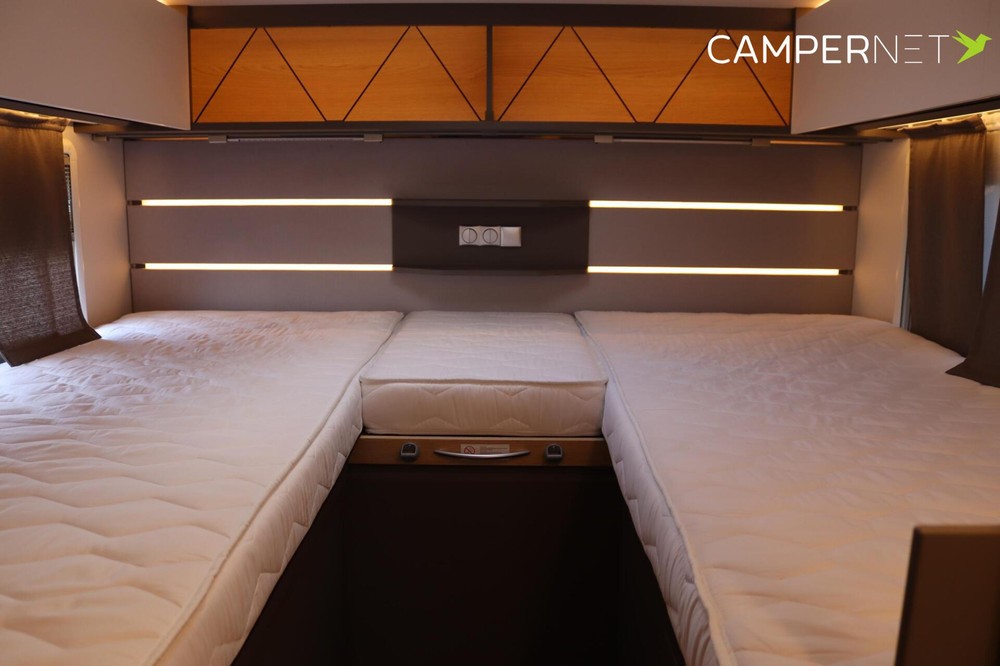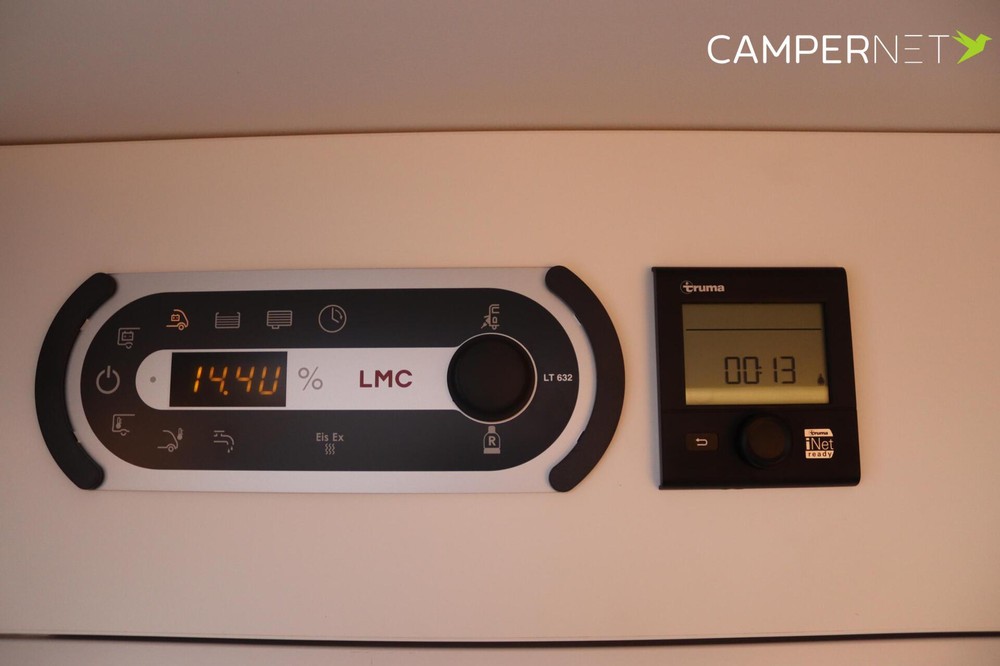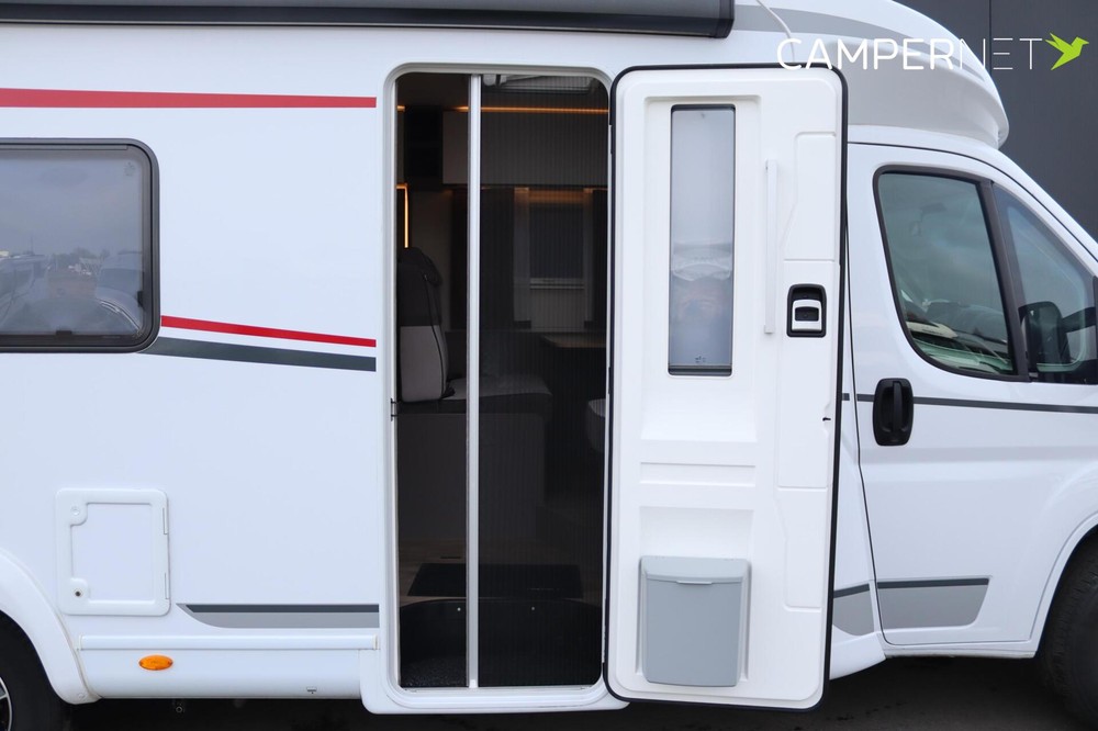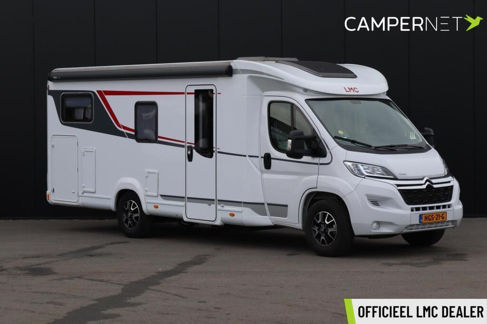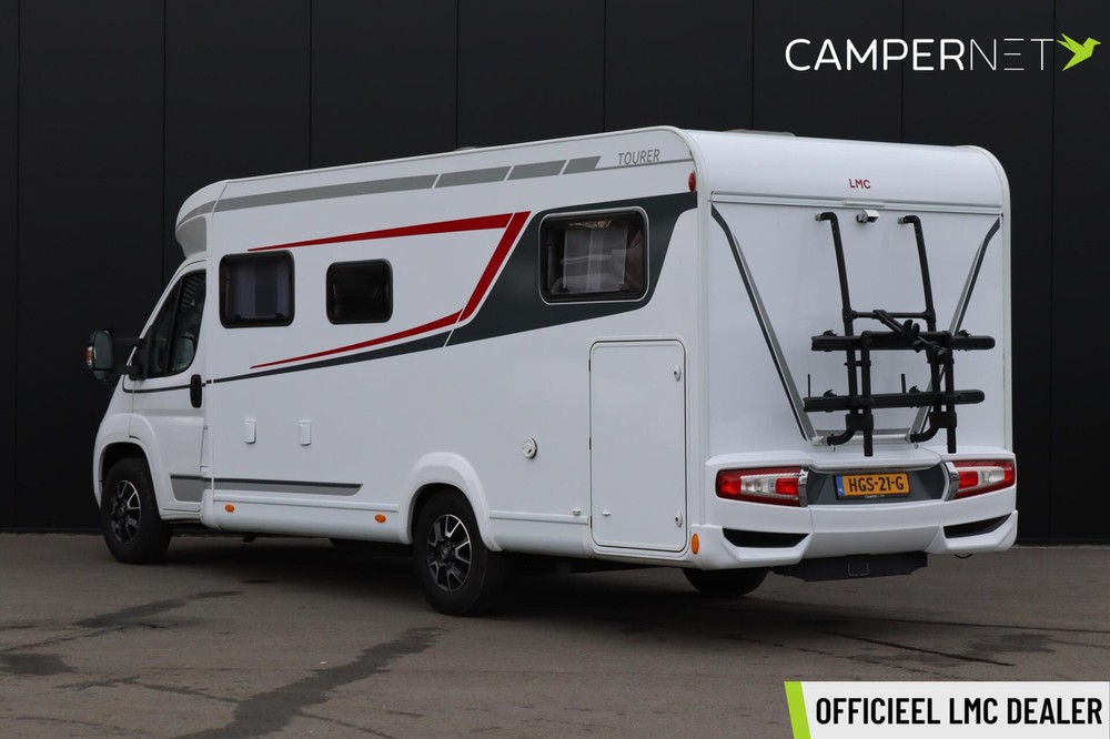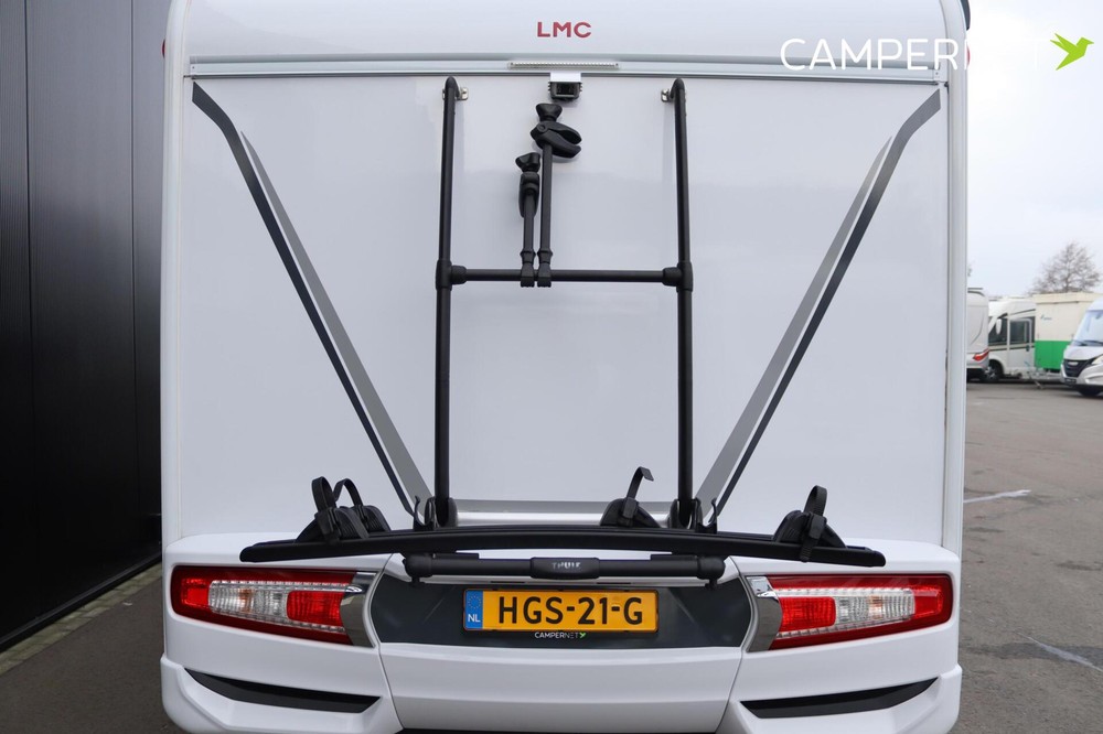 De moderne LMC Tourer T 730 G met lengte bedden met o.a. skyroof, cruise control, dubbele airbag, Thule luifel, Thule fietsendrager plissé hordeur, hagelbestendig GFK dak en zijwanden , Zenec Multimediasysteem.