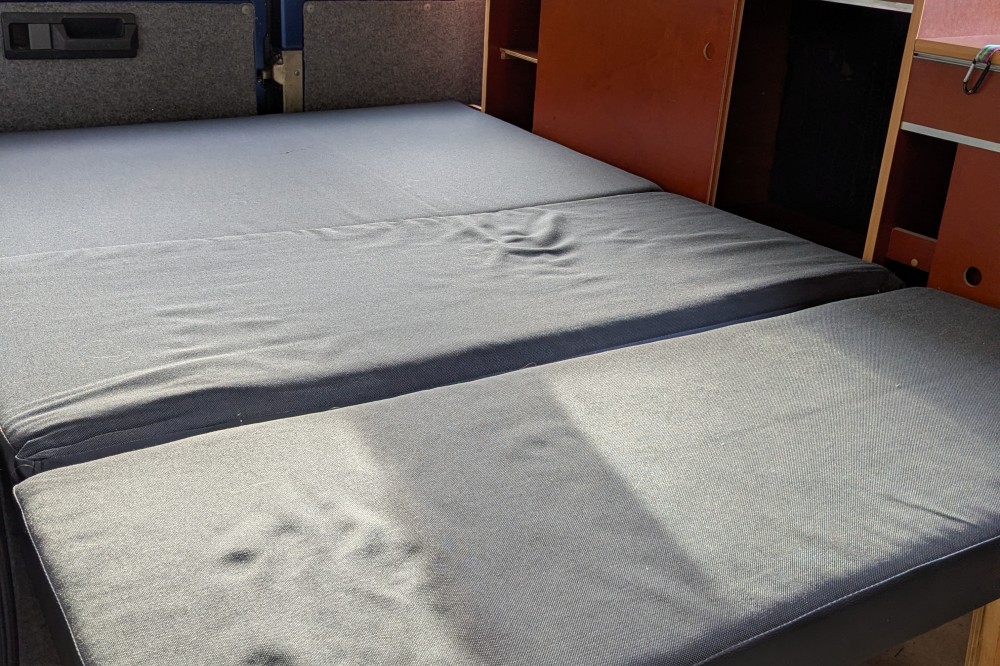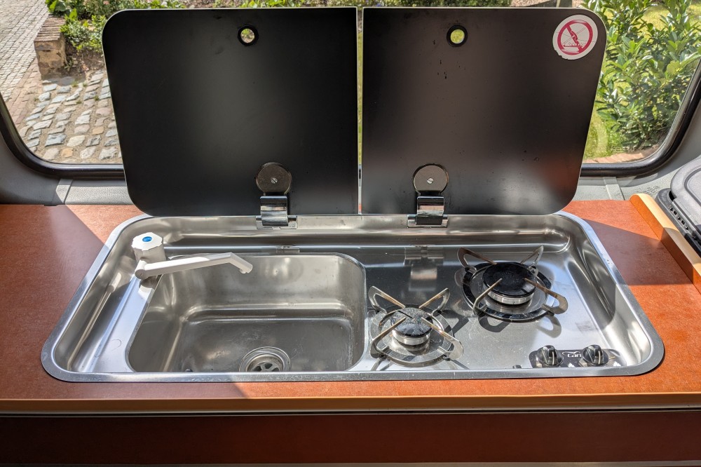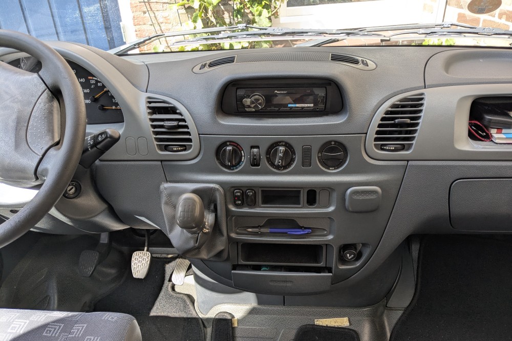 Indeling: zitbank, uittrekbaar tot tweepersoons lengtebed (130 breed), aanrecht met spoelbak en 2-pitsfornuis. Tafel aanklikbaar aan aanrecht. Bijrijdersstoel draaibaar. Bergruimte onder het bed. Twee lampjes met dimstand, twee stopcontacten bij het aanrecht, een in de bijrijdersstoel. Aparte huishoudaccu. Deels geïsoleerd. De isolerende raamverduistering en de luifel zijn bij de prijs inbegrepen.