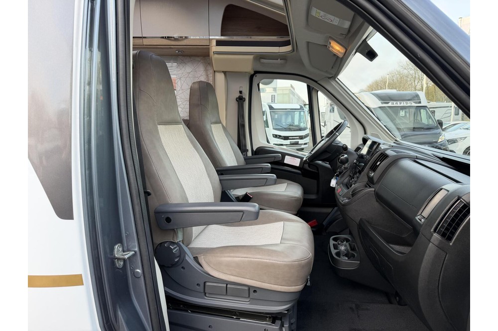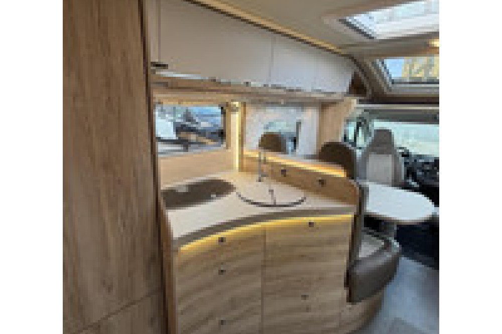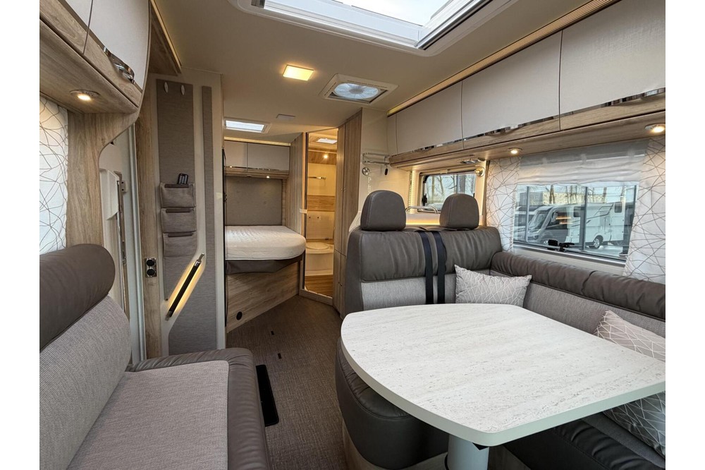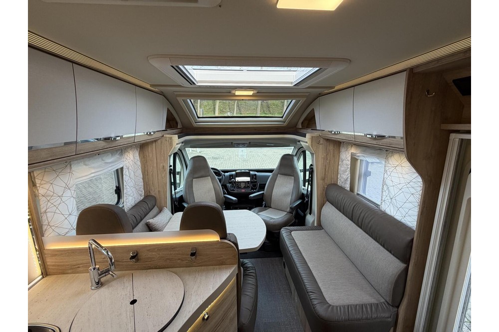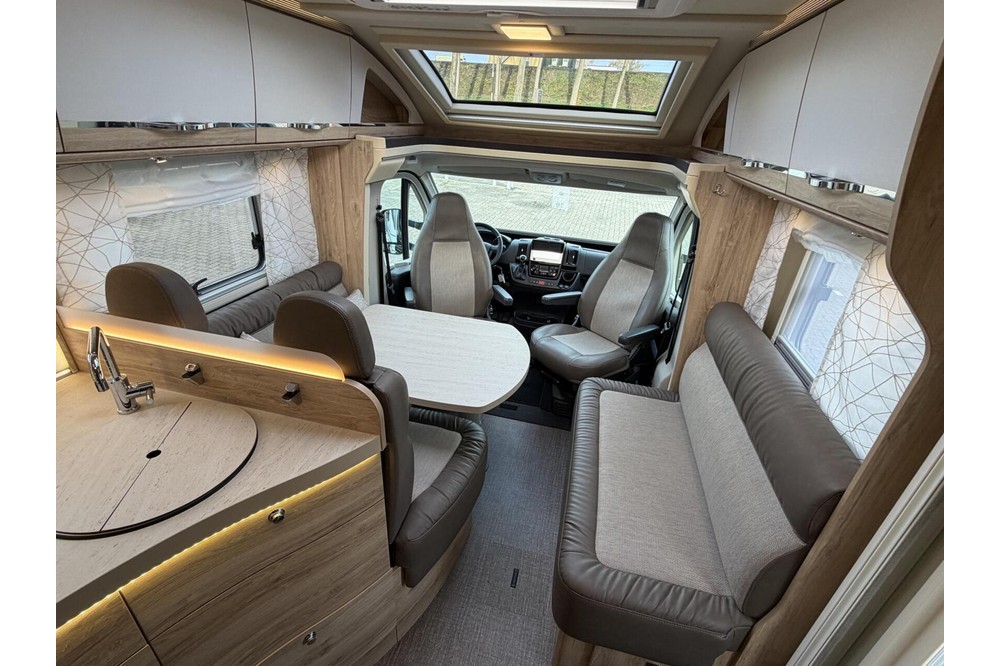 Het betreft een camper met zeer gewilde indeling met ruime rondzit dmv draaistoelen en lange bank een L keuken met XXL koelkast, een aparte douche/toilet CL ruimte, een ruim fransbed en de royale zit om te bouwen ook als slaapruimte voor 2 personen . Uiteraard is deze camper van alle gemakken voorzien, zoals motor airco, Maxxfan, Zonnepaneel , cruise control, Panorama dakraam , Automatische schotel met tv , Achteruitrijcamera, Ruime garage, Lift- fietsenrek , Luchtvering en nog veel meer!