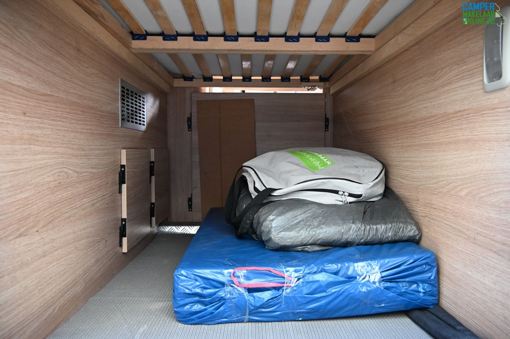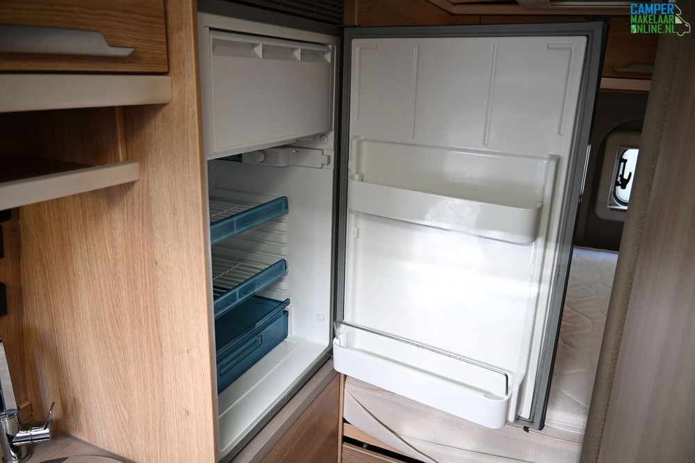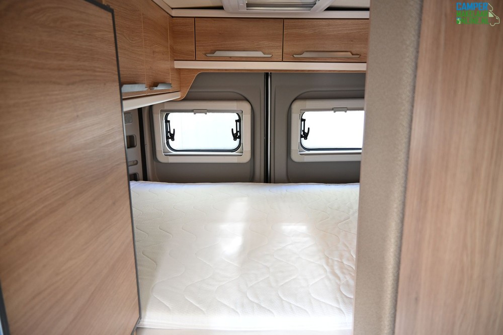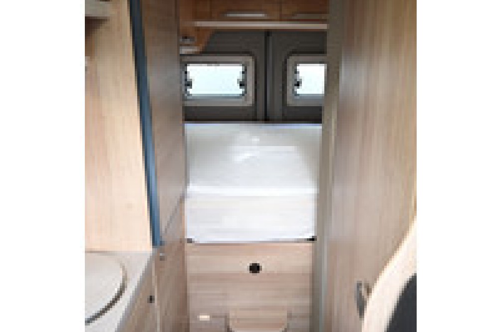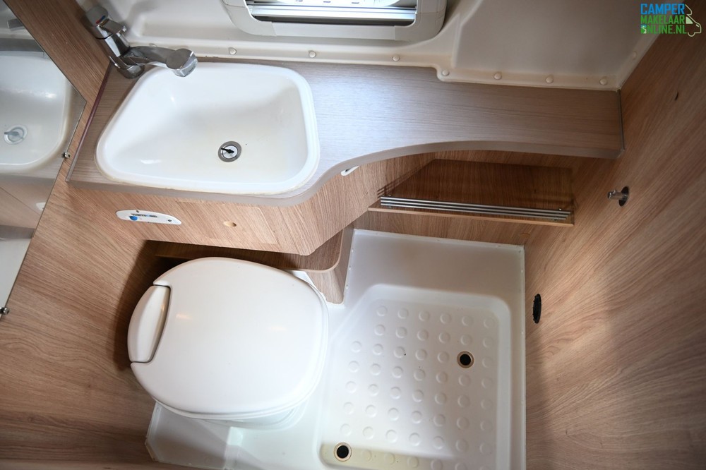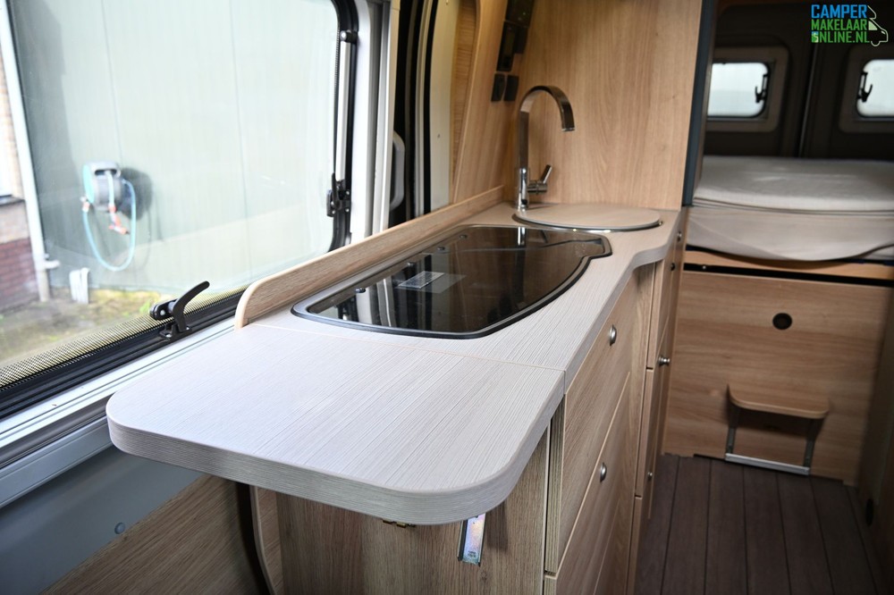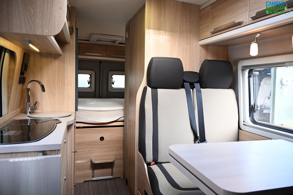 De Camper heeft een ruime Indeling en omvat een vast dwarsbed achterin, een keukenblok met spoelbak en kooktoestel, een badkamer met douchegelegenheid en een zithoek die plaats biedt aan 3 tot 4 personen.