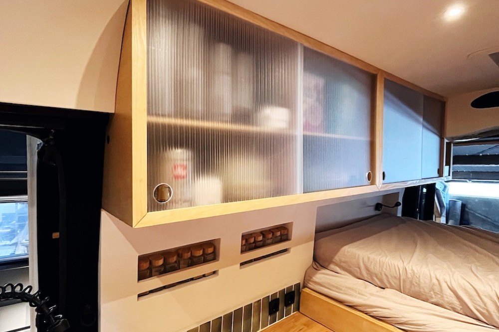 • Hoge kastjes met schuifdeuren boven keuken en bed aan één zijde