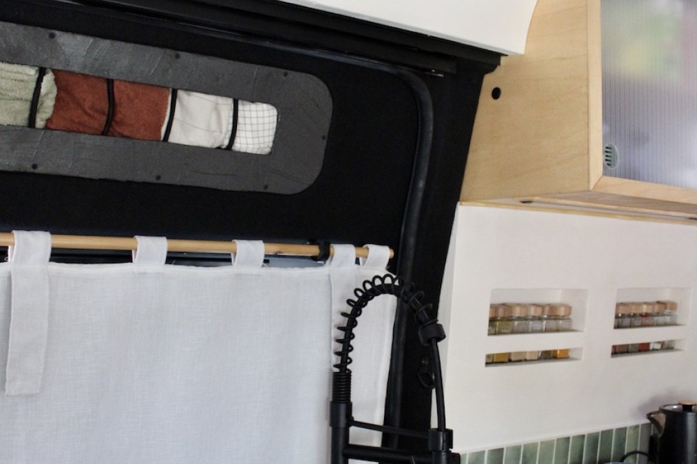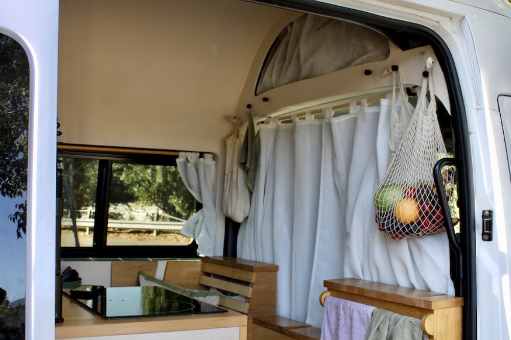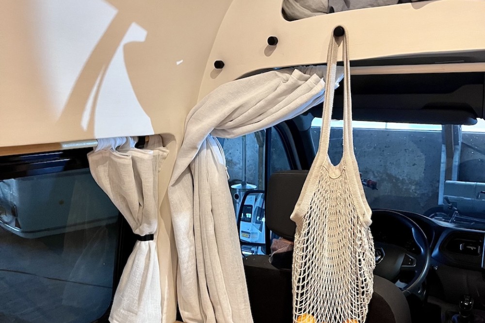 • Verduisterende gordijnen die het rijgedeelte afsluiten van het woongedeelte